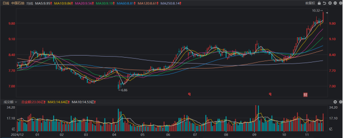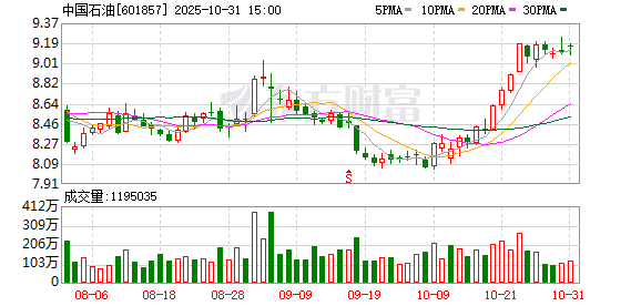 今日(11月19日),中国石油获长阳拉升,截至收盘,其收涨近4.05%,全天成交额近23.06亿元。同时,其盘中股价一度涨至10.32元,创2015年7月以来近10年新高。